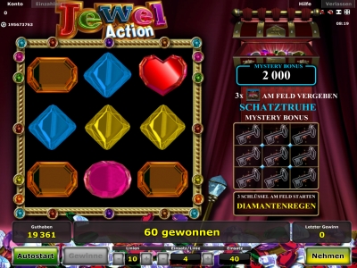 Unterstützt wirst du in Jewel Quest durch Joker und den Diamantenregen. Letzteres ist ein Bonusspiel, das durch das Erscheinen von wenigstens drei Schlüsseln ausgelöst wird. Durch die Vollbildgewinne, die im Diamantenregen ausgelöst werden, kannst du das bis zu 500-fache des jeweiligen Liniengewinns ergattern. Und auch die Schatztruhen haben eine besondere Bedeutung, denn drei von ihnen schütten einen zufälligen Mystery Gewinn aus – unabhängig davon, auf welchen Walzenpositionen sie erscheinen. Insgesamt bietet dir Jewel Action sehr gute Möglichkeiten, deine getätigten Einsätze bei Stargames um ein Vielfaches zu vermehren und in Form hoher Gewinne ausschütten zu lassen.