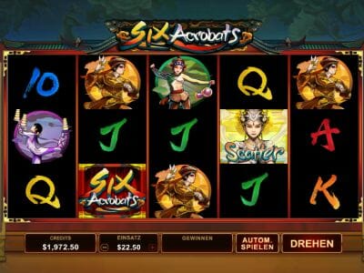 Bühne frei für die Six Acrobats. Es handelt sich um einen Spielautomaten, der die akrobatischen Künste näher bringt. Der Hintergrund ist als Bühne und gleichzeitig als blumiger Hintergrund im asiatischen Stil gehalten. Die Vertonung stammt ebenfalls aus Fernost, was der Atmosphäre aber keinen Abbruch tut. Grundsätzlich weiß das Automatenspiel Six Acrobats zu überzeugen. Dies spiegelt sich nicht zuletzt in den potentiellen Gewinnen wieder, welche schon mit einer glücklichen Drehung zu erspielen sind.