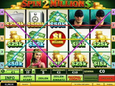 Bei Spin 2 Million darfst du dich für bis zu fünf Gewinnreihen entscheiden, welche über dein persönliches Glück entscheiden werden. Der Mindesteinsatz von gerade einmal fünf Cent pro Spielrunde wird dir Anlass geben, dich schon bald vom Spaßmodus zu lösen und in den Spielautomaten Online Echtgeldmodus überzugehen. Schließlich winken hier wirklich attraktive Gewinnsummen, die du dir im Falle des Echtgeldspiels sichern kannst.